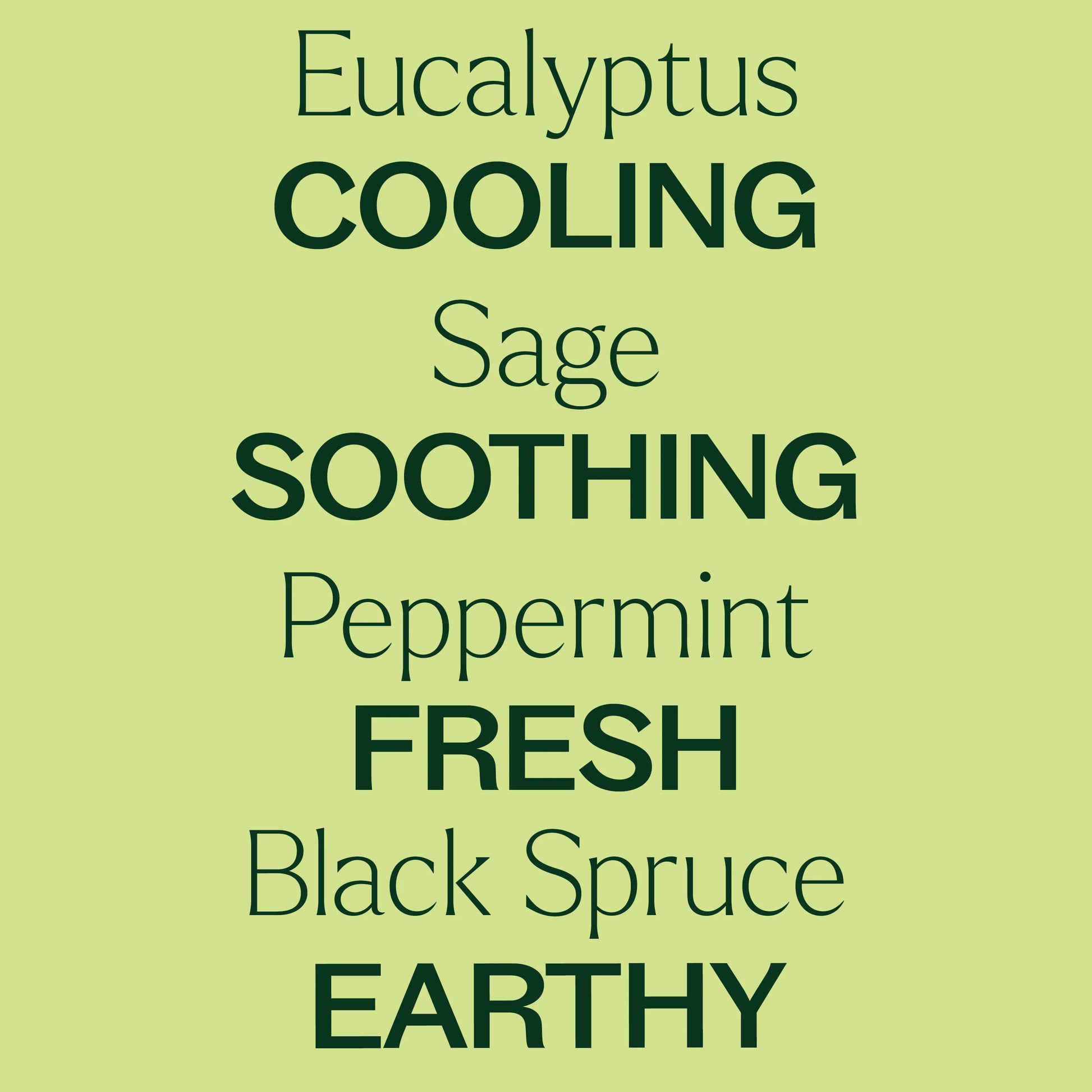 Aqua (Water), Butyrospermum Parkii (Shea) Butter, Glycerin, Caprylic/Capric Triglyceride (FCO), Glyceryl Stearate, Dicaprylyl Ether, Cetearyl Alcohol, Amyris Balsamifera Bark Oil, Citrus Aurantifolia (Key Lime) Peel Oil, Eucalyptus Dives Leaf/Twig Oil, Juniperus Mexicana (Texas Cedarwood) Oil, Mentha Piperita (Peppermint) Oil, Picea Mariana (Black Spruce) Leaf Oil, Salvia Officinalis (Sage) Oil, Alpha-Phellandrene (Isolate), Cetyl Alcohol, Glyceryl Caprylate, Sodium Polyacrylate, Sodium Stearoyl Glutamate, Cetearyl Glucoside, Xanthan Gum, Caprylhydroxamic Acid, Sodium Phytate, Aloe Barbadensis (Aloe Vera) Leaf Juice, Camellia Sinensis (Green Tea) Leaf Extract, Cucumis Sativus (Cucumber) Fruit Extract, Mangifera Indica (Mango) Fruit Extract, Persea Gratissima (Avocado) Fruit Extract
