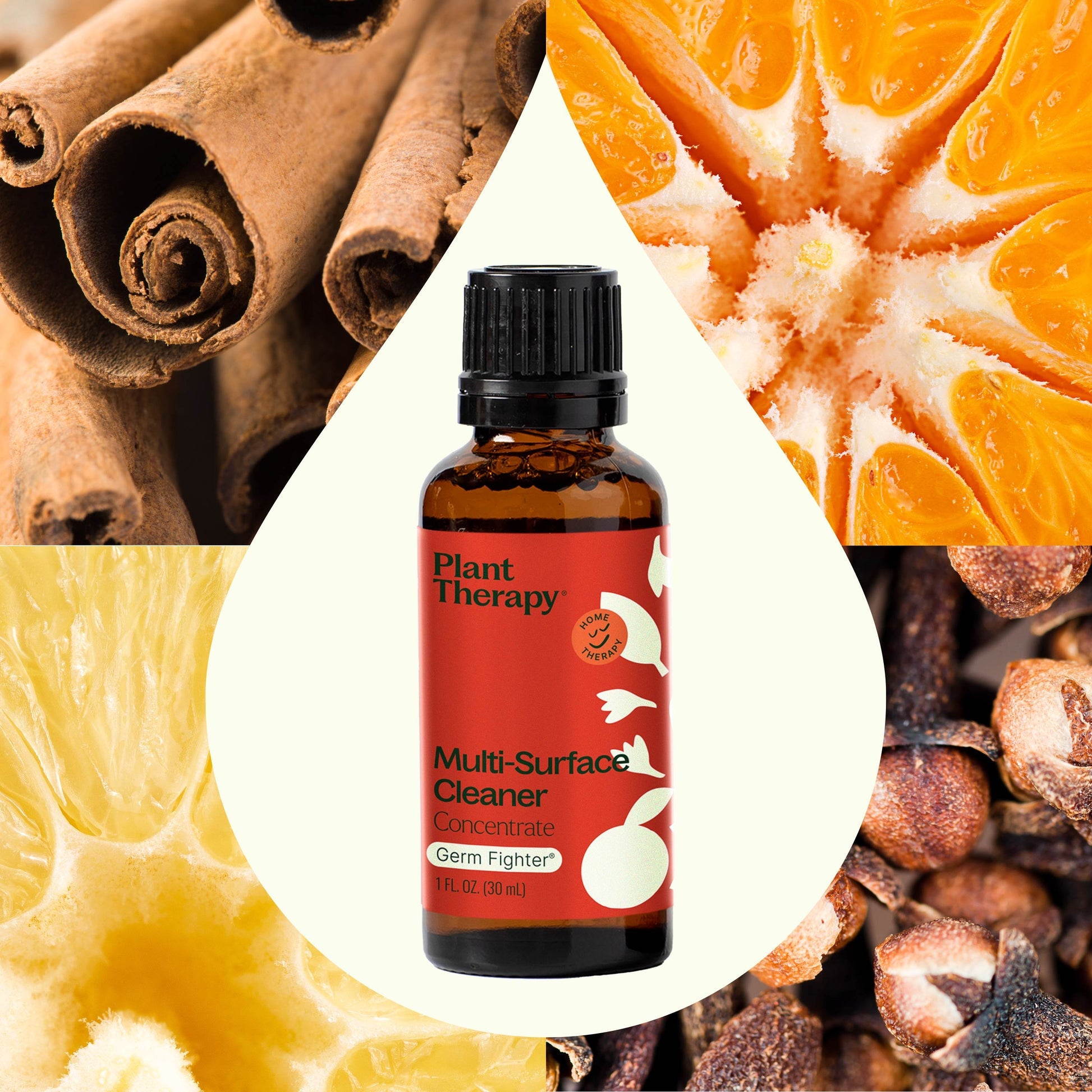 Germ Fighter Multi-Surface Cleaner combines plant-based power and essential oils to cut through grease and grime without harsh chemicals. Infused with essential oils like Blood Orange, Cinnamon Leaf, Eucalyptus, Frankincense and Rosemary, this cleaner naturally purifies and refreshes your space while tackling tough messes on sealed surfaces such as countertops, stovetops, and microwaves.