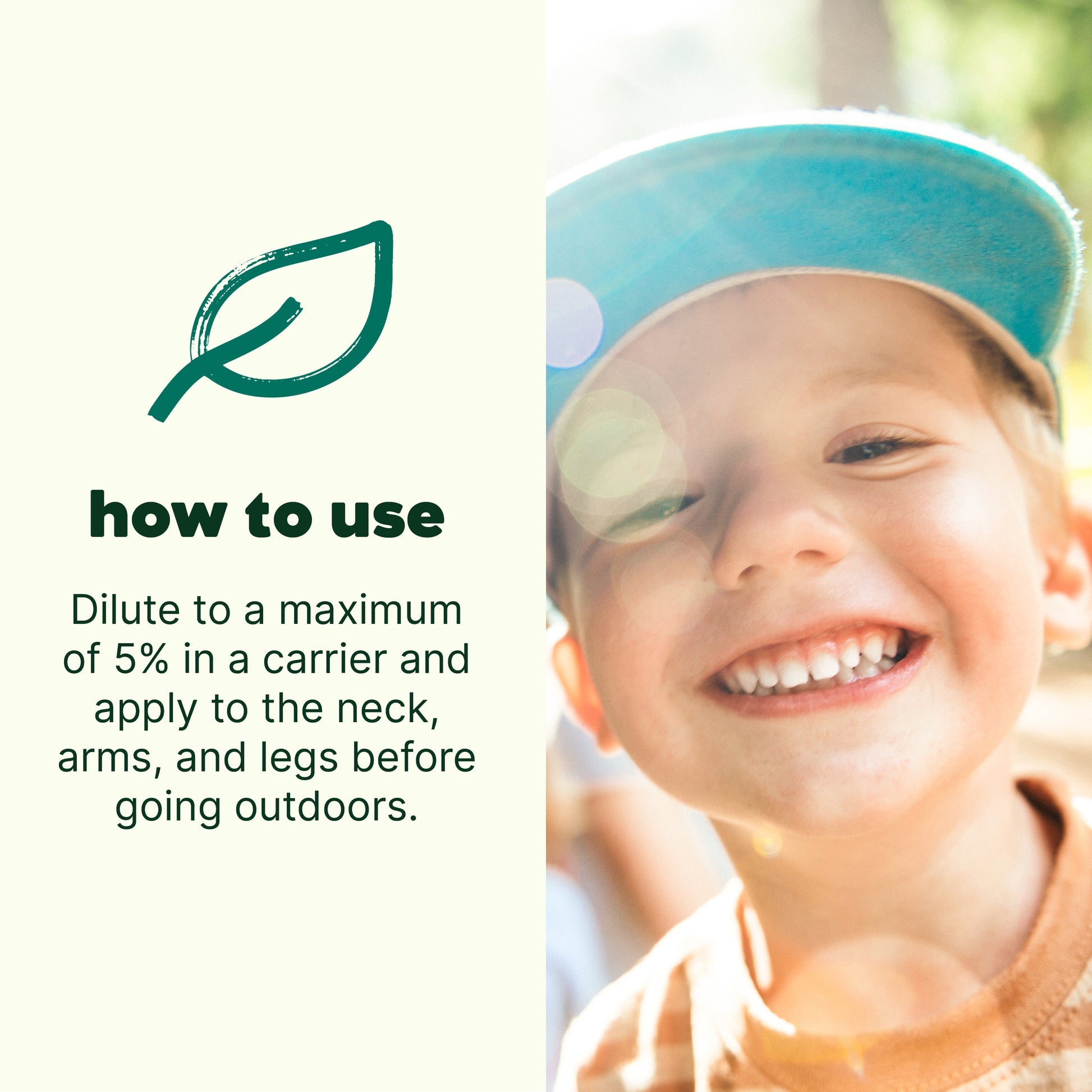 Topical: Dilute to a maximum of 5% in a carrier and apply to the neck, arms, and legs before going outdoors.