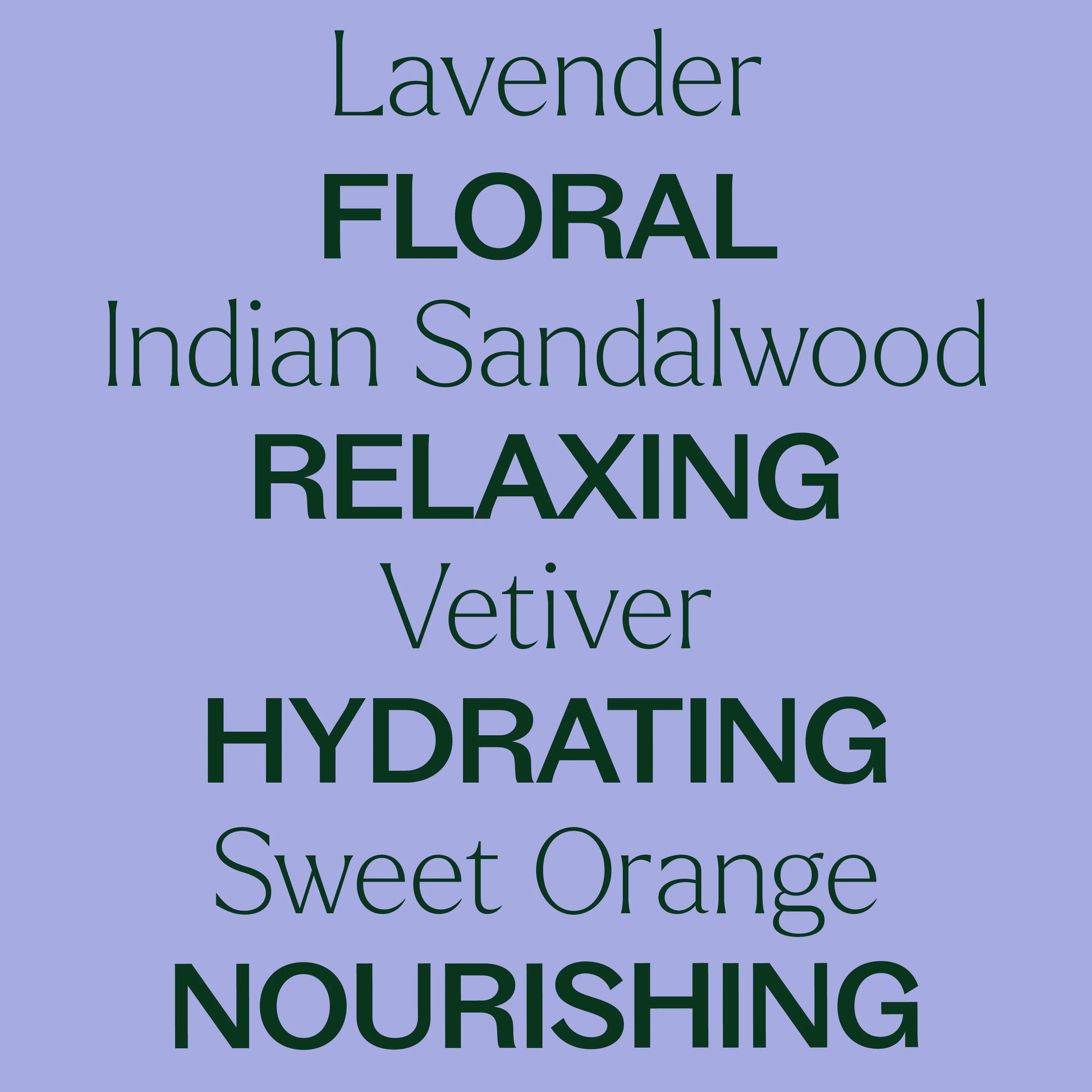 Aqua (Water), Butyrospermum Parkii (Shea) Butter, Glycerin, Caprylic/Capric Triglyceride (FCO), Glyceryl Stearate, Dicaprylyl Ether, Cetearyl Alcohol, Citrus Aurantium Dulcis (Sweet Orange) Peel Oil, Citrus Limon (Lemon) Fruit Extract, Lavandula Angustifolia (Lavender) Oil, Lavandula Intermedia (Lavandin) Flower/Leaf/Stem Oil, Santalum Album (Indian Sandalwood) Oil, Vetiveria Zizanoides (Vetiver) Root Oil, Cetyl Alcohol, Glyceryl Caprylate, Sodium Polyacrylate, Sodium Stearoyl Glutamate, Cetearyl Glucoside, Xanthan Gum, Caprylhydroxamic Acid, Sodium Phytate, Aloe Barbadensis (Aloe Vera) Leaf Juice, Camellia Sinensis (Green Tea) Leaf Extract, Cucumis Sativus (Cucumber) Fruit Extract, Mangifera Indica (Mango) Fruit Extract, Persea Gratissima (Avocado) Fruit Extract