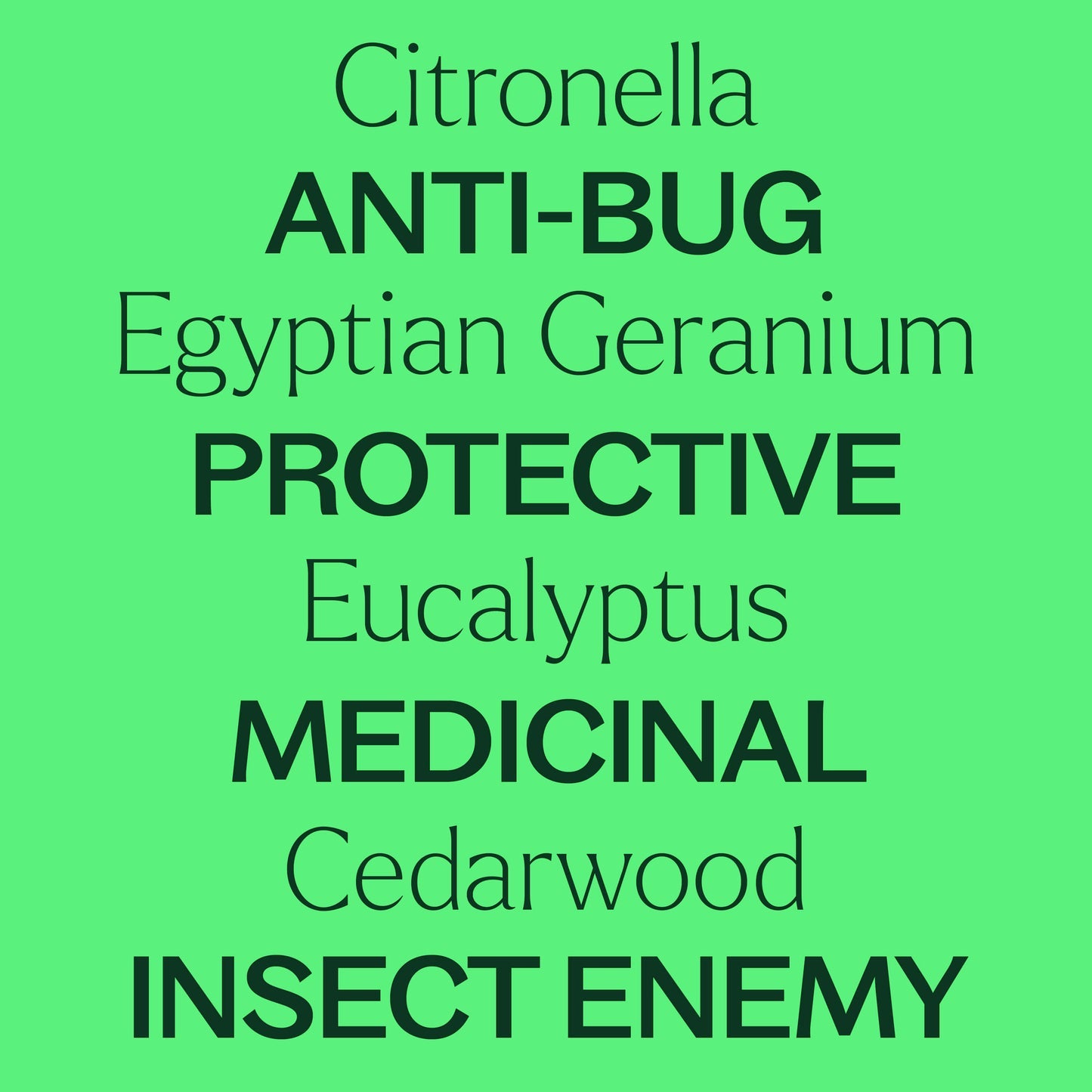 Cymbopogon Winterianus (Citronella) Leaf Oil, Pelargonium Graveolens (Egyptian Geranium) Leaf Oil, Cymbopogon Flexuosus (Lemongrass) Leaf Oil, Eucalyptus Globulus Leaf Oil, Juniperus Virginiana (Virginian Cedarwood) Oil, Lavandula Angustifolia (Lavender) Oil, Melaleuca Alternifolia (Tea Tree) Leaf Oil, Nepeta Cataria (Catnip) Oil, Pogostemon Cablin (Patchouli) Leaf Oil